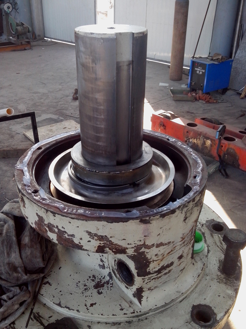 2014-06-09 客戶HP500圓錐破碎機的水平軸殼體因過度磨損不能繼續(xù)使用,運到我公司維修。由我司技術人員拆解水平軸總成,更換新的水平軸殼體,銅套,護板。