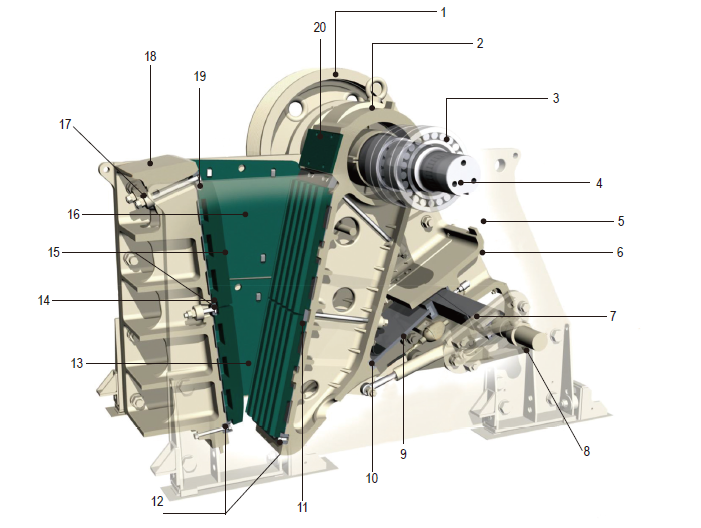 LCC 系列顎式破碎機(jī)采用了獨(dú)特的模塊式、無(wú)焊接框架結(jié)構(gòu),兩塊熱軋鋼側(cè)板通過(guò)精密加工的緊固螺栓與高質(zhì)量鑄鋼機(jī)架牢固地栓接在一起;動(dòng)顎總成采用高質(zhì)量的鑄鋼件構(gòu)成,通過(guò)兩個(gè)大型鑄鋼飛輪傳動(dòng);鍛造的重型偏心軸和四個(gè)同等規(guī)格的大型球型滾動(dòng)軸承,使之具有超凡的可靠性;迷宮式密封保護(hù)軸承中的潤(rùn)滑油脂不被污染;整體鑄鋼軸承箱能夠保證與破碎機(jī)架完全配合,并且還能避免對(duì)軸承架造成過(guò)大的負(fù)荷。