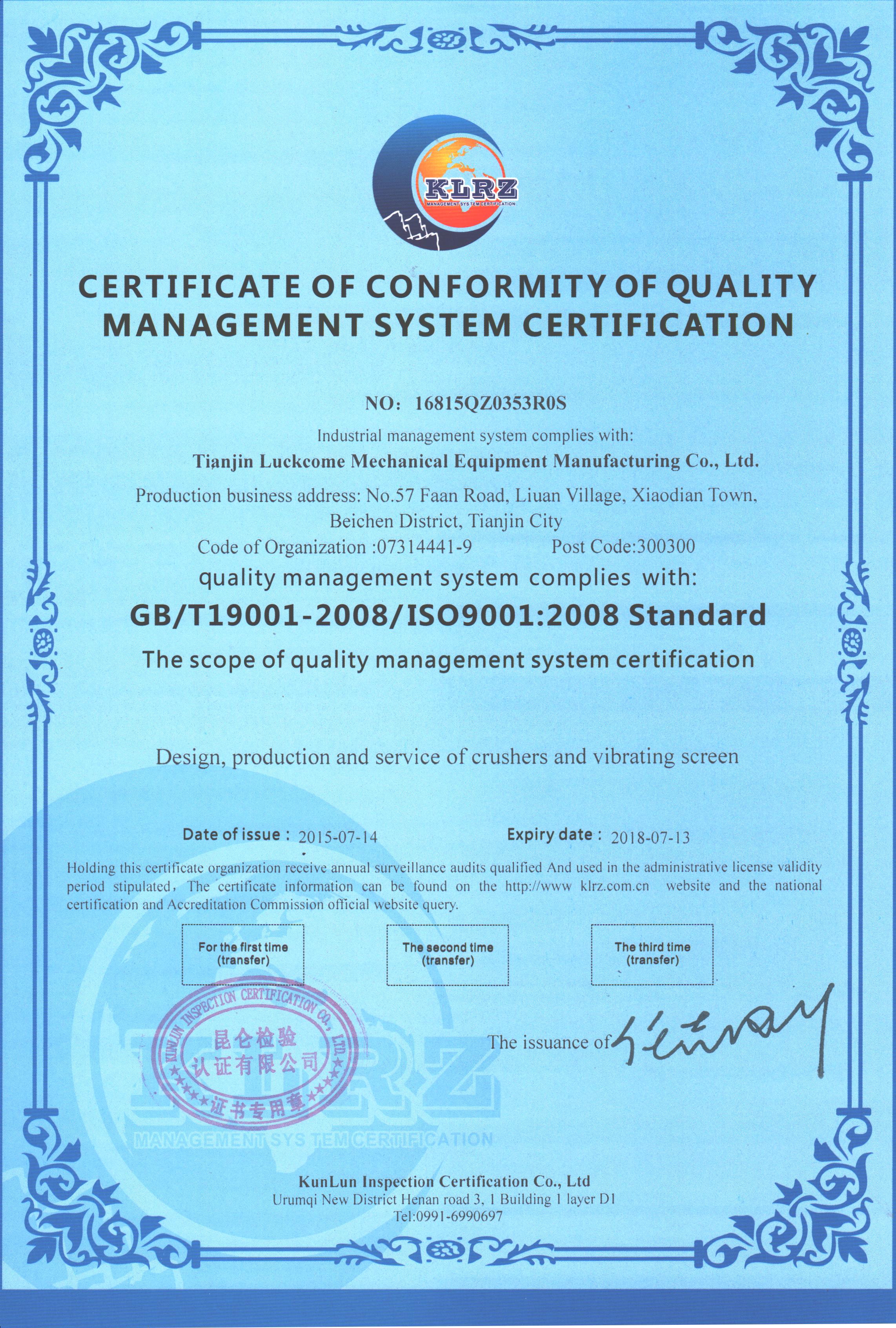 In July 3, 2015, The Association two experts of Quality Assurance Center   visited our company,Conduct on-site assessment of the company's quality management system certification.After  the expert group careful examination , company of the audit projects have reached the ISO9000 quality management system standards, successfully passed the quality management system audit.We work to pay the strict implementation of quality management system and regulations  in the future, in strict accordance with the standards of production, continuously improve the quality of products, to provide high quality products and services for the mining industry!